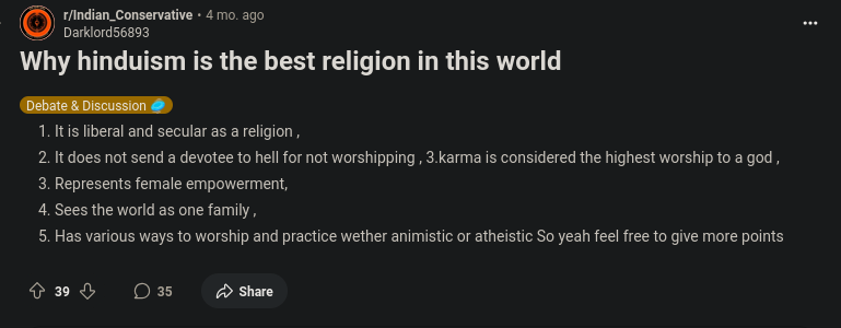 Yet if I say this today, rāytās call this blasphemous and “Abrahamic”. Instead, they see “sustainability” in “Dharma” because “dhṛ” means “sustain” (if you do not laugh at the stupidity of this argument you have an IQ < 40), and say things like “Hinduism is about living in harmony with nature, we were the original environmentalists”—none of which are serious claims anybody made before the 20th century.