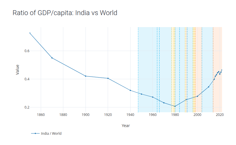 That third group would become the Bhāratīya Janatā Party in the 1980s—parallelly, Indian industrialists would take more direct interest in influencing economic policy, the hold of the Nehruvian Rāj would weaken and the ratio of Indian to world economy would finally start growing for the first time in over 1480 years.